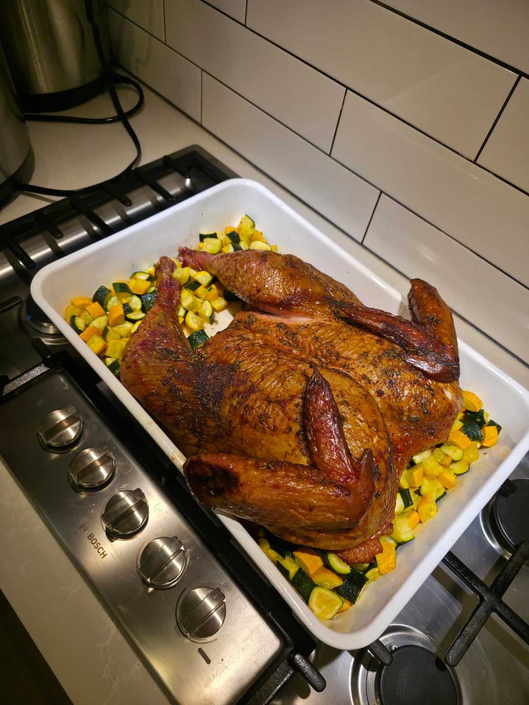 Just a butter & herb rub on the outside, smoked at 250 until 165 inside, took about 4 hours. Kept it warm with some zucchini I roasted in the oven, then cut it up for dinner and laid it on a bed of stuffing.