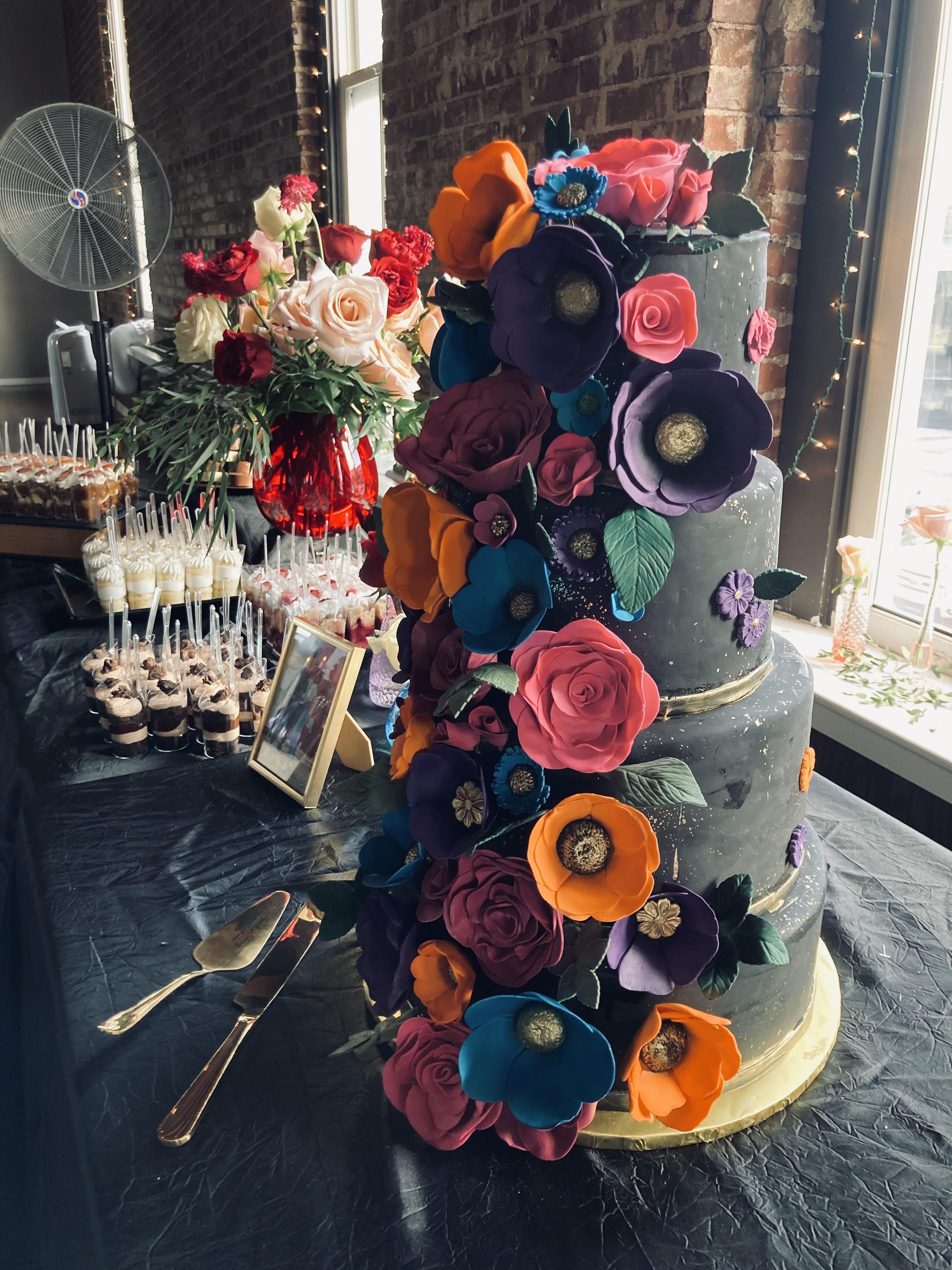My mom made the wedding cake, road tripped 5 hours to the hotel, transported it to the venue, then decorated it there. 95% of the fondant flowers survived which was more than expected! The bride and groomed picked our color swatches from Home Depot and she went and found them to color match. All gluten-free and it was WARM in there!! She’s a beast. (Also made 200 dessert shots bc why not)