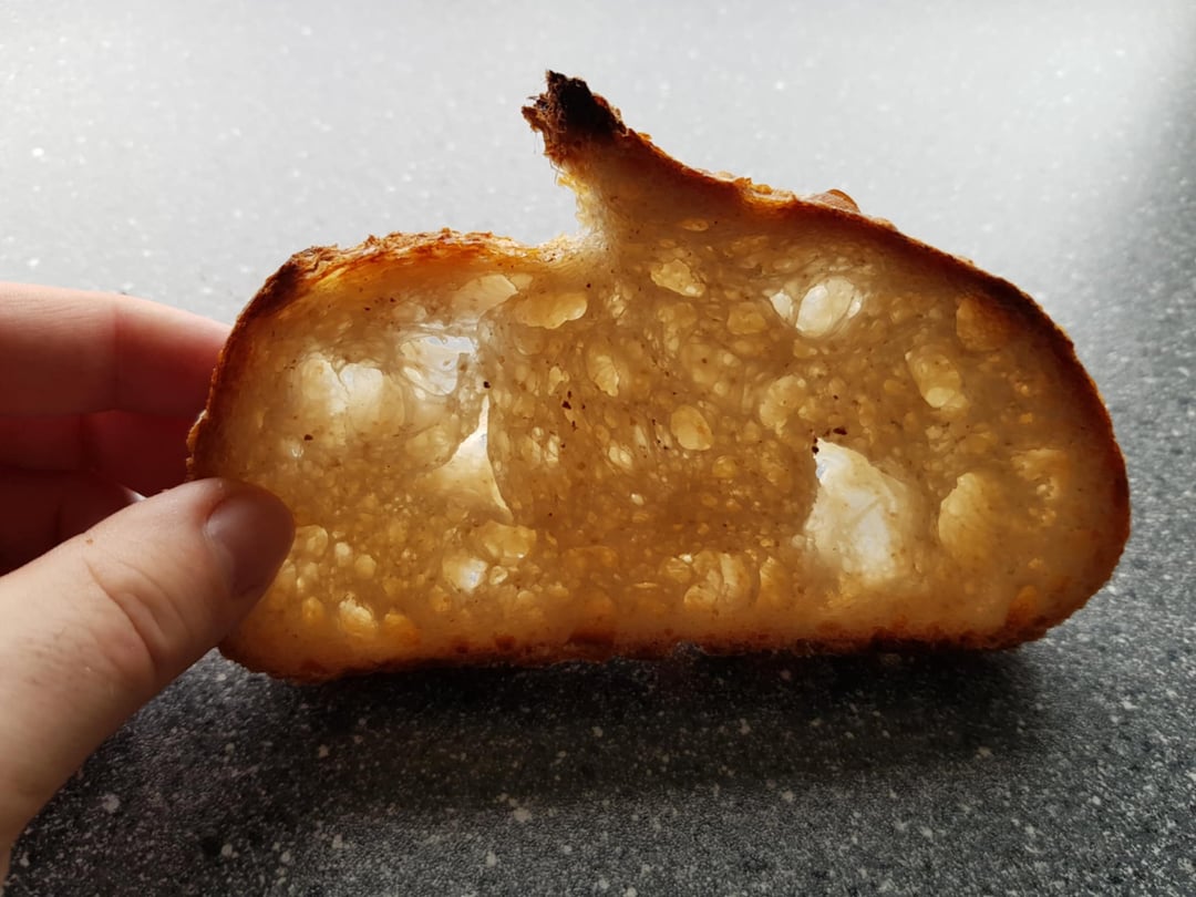 I also did coil folds whenever the dough appeared to flatten out, 5 or 6 times with varying timing. Bulk fermented longer than suggested because I know that's how my starter and environment works. Shaped very loosely, which might be why there's uneven tension in the loaf, and it opened up weirdly. Oh well, I care more about the crumb than the outside aesthetic. Nice and soft, really good to eat.