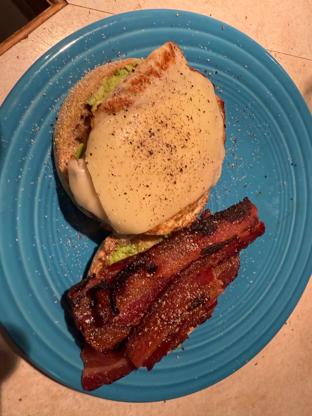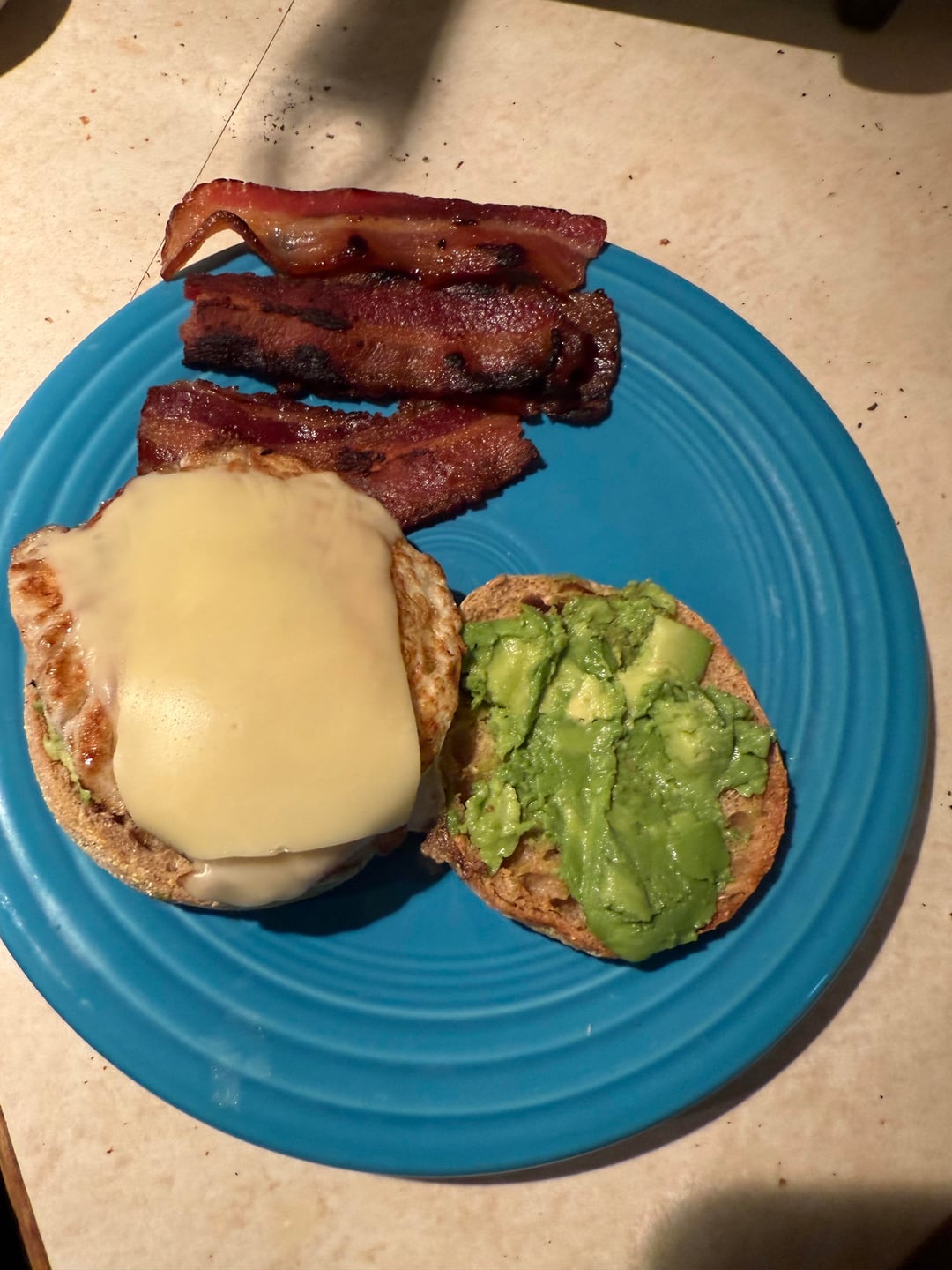 Avocado, egg, cheese, bacon on English muffin
