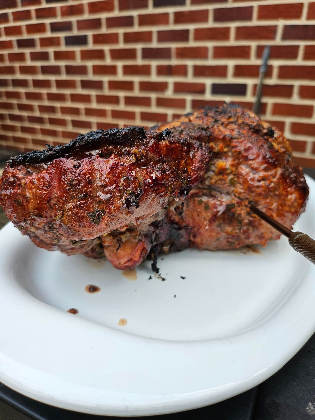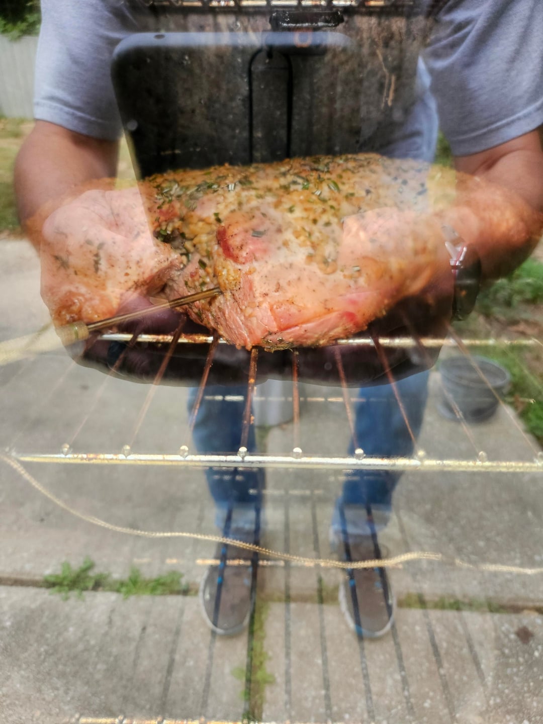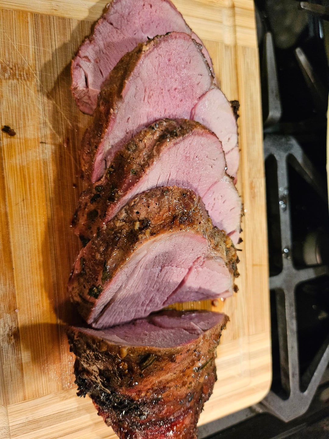 Rubbed with a yellow mustard binder, salt, pepper, minced garlic, freshly chopped rosemary and thyme. Smoked at 240°- 260° until internal was 130°, removed from smoker and seared on the grill until 140° internal. Smoked with pecan.