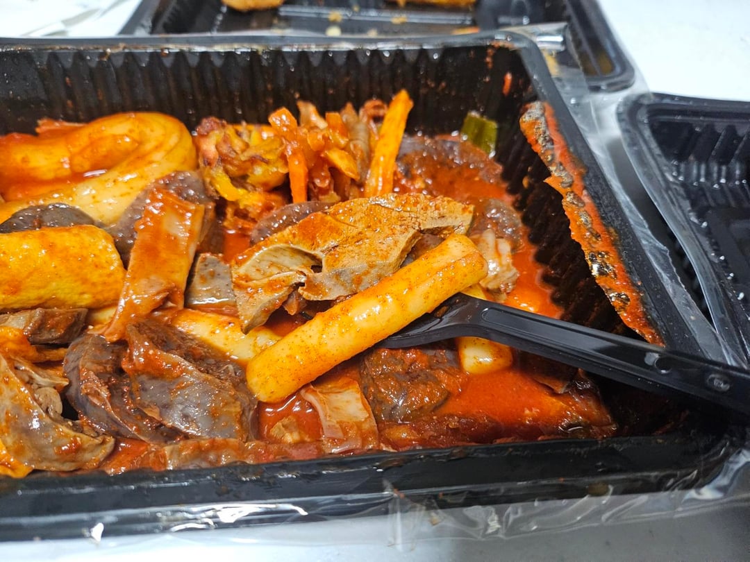 After a long day, I ordered this tteokbokki combo set — spicy rice cakes, assorted fried snacks, and soondae (Korean blood sausage).