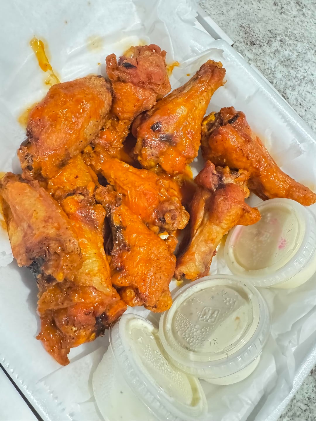 Nice local bar with some solid wings. Got their medium buffalo via takeout and it didn’t disappoint. Very good blue cheese with some robust flavor that pairs very well with their buffalo sauce.