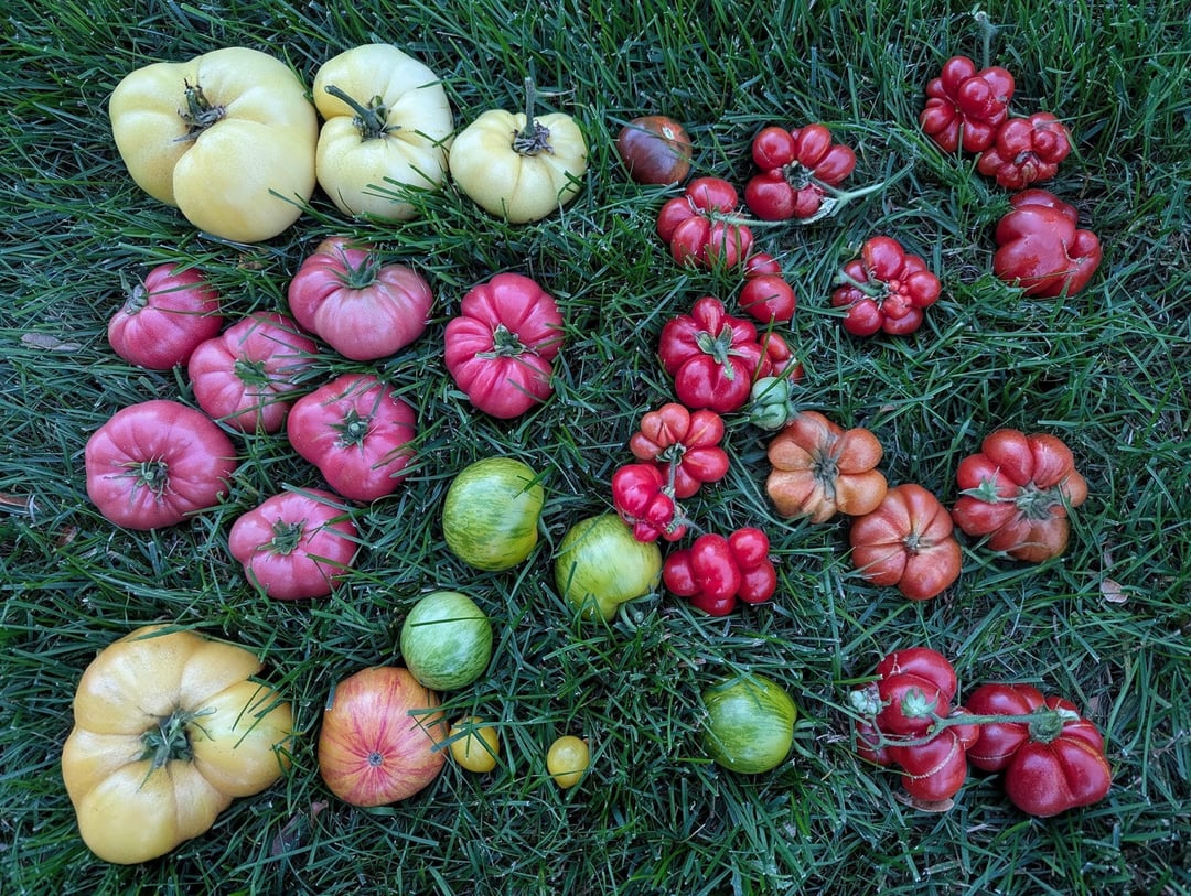 More fresh picked home garden heirloom tomatoes, including Reisetomate, True Black Brandywine, Isopolin, Ferris Wheel, Copia, Great White, Green Zebra, Pineapple & Fargo Yellow Pear varieties