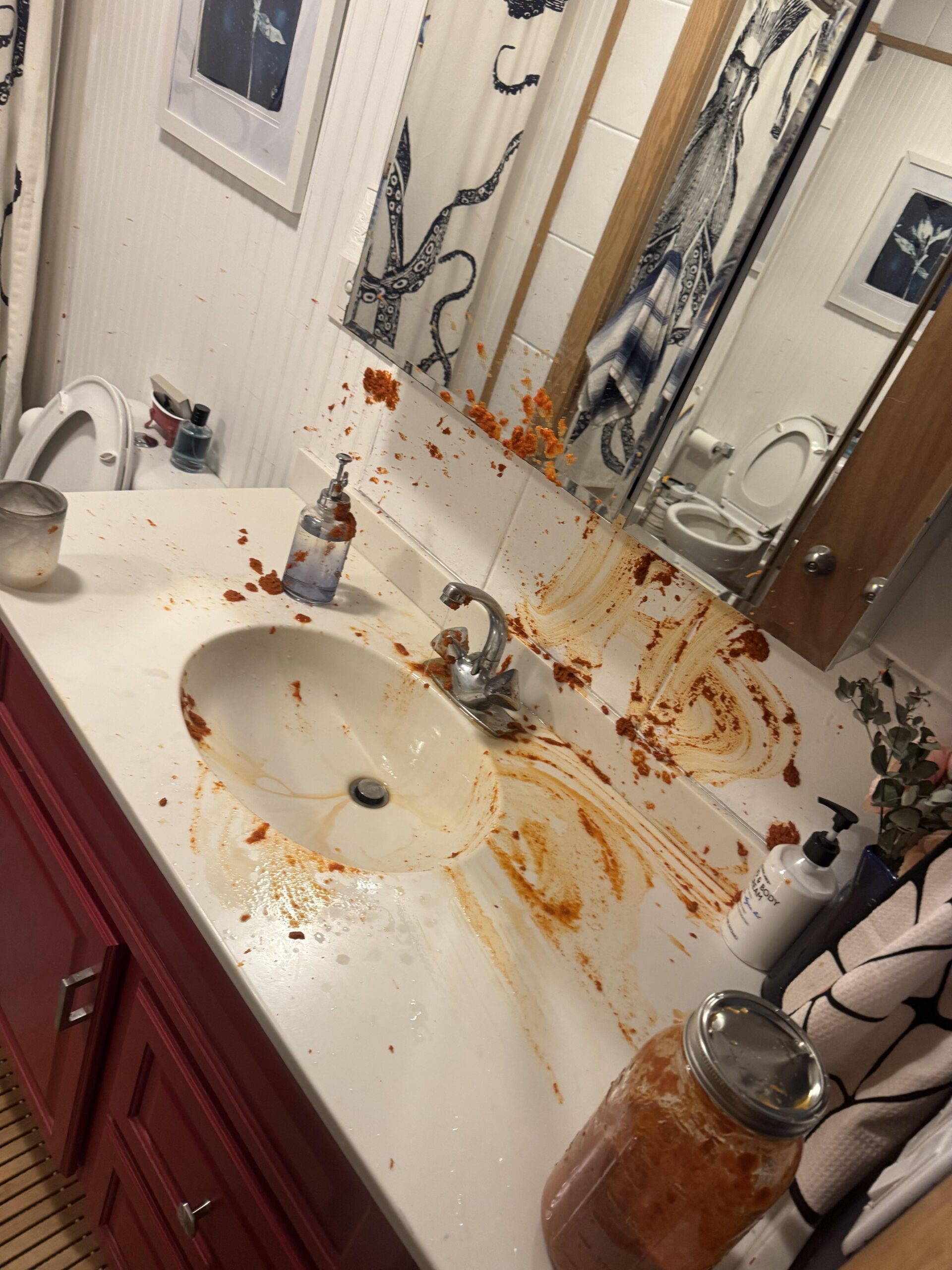 However, I do appreciate the humor at OP’s expense. Cleaning up red pepper mash/sauce is a major pain. It has happened to plenty of us, just not in the bathroom. Usually hot sauce has this effect AFTER you eat it, not before.