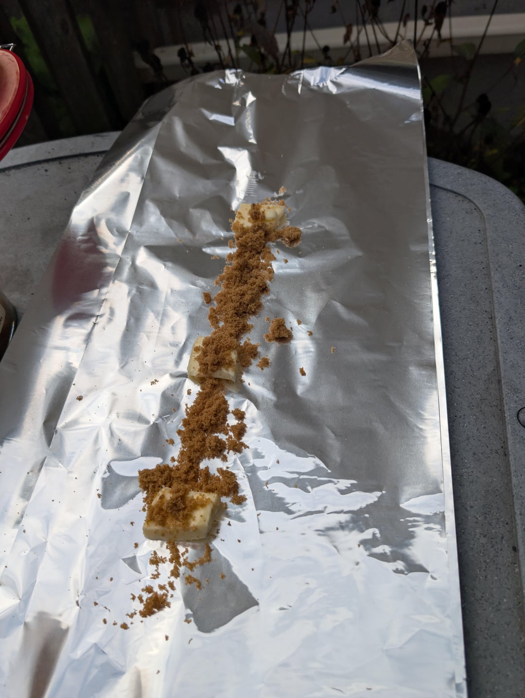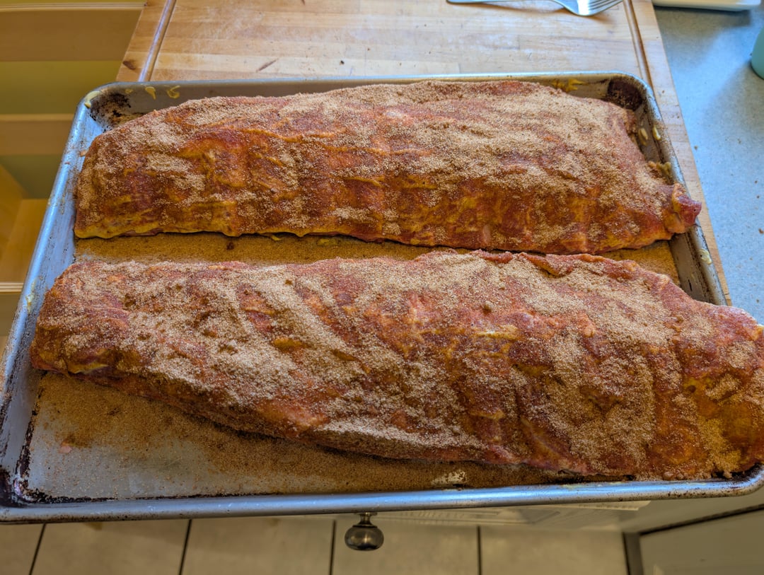 Coated with Dijon mustard, dry rub was brown sugar, onion powder, garlic powder, salt, pepper, cumin, paprika.