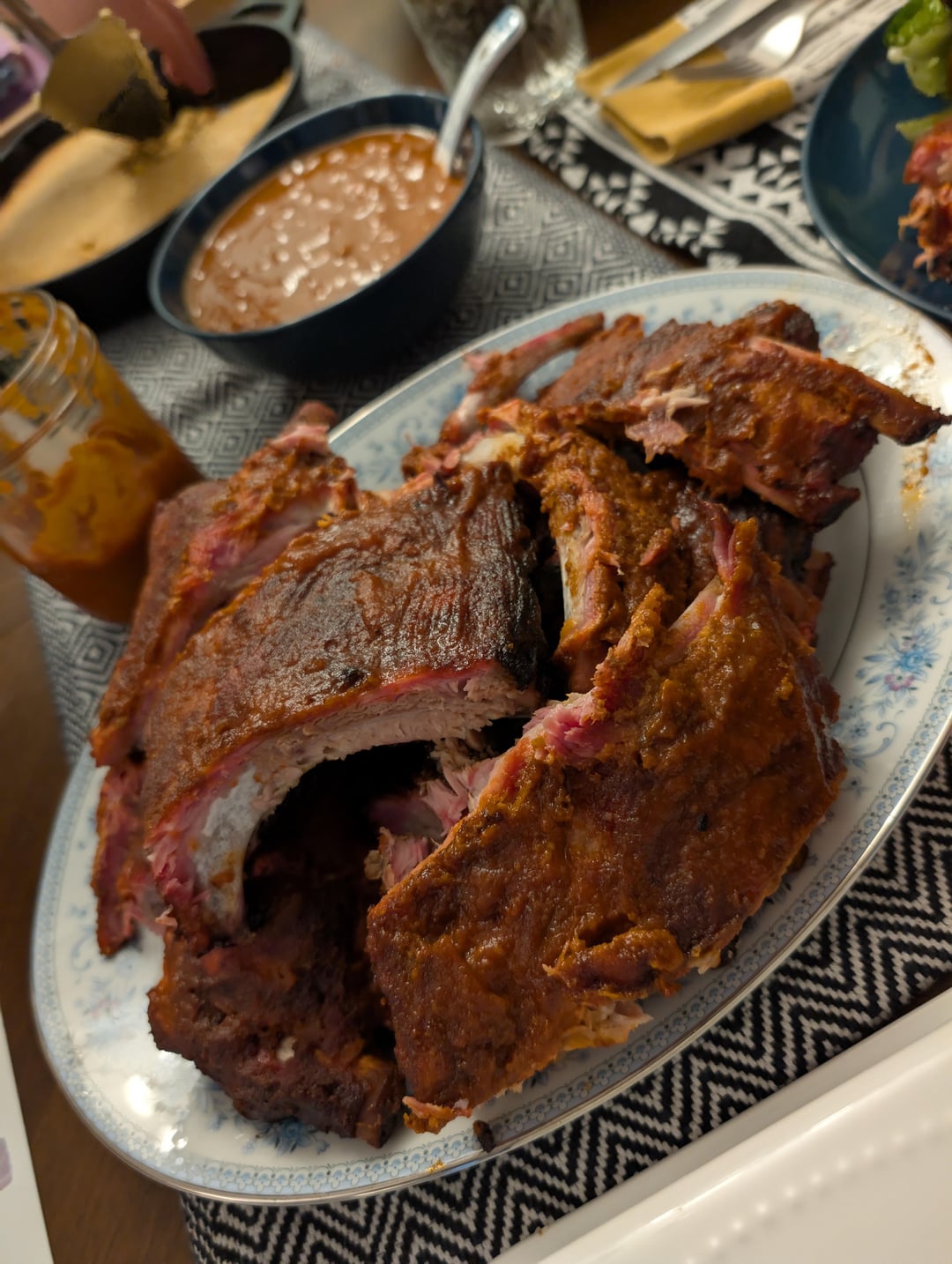 The ribs went on the Webber kettle using the snake method, jealous devil briquettes, smoked for 2 hours with cherry wood chunks, the wrapped tightly in foil with a few pads of butter, some brown sugar and a splash of apple cider vinegar and cooked for another 2 hours, then coated with the bbq sauce and cooked openly for 1 hour. Grill was at about 250 275 degrees the whole time. Didn't temp the meat so I don't know pull temp.