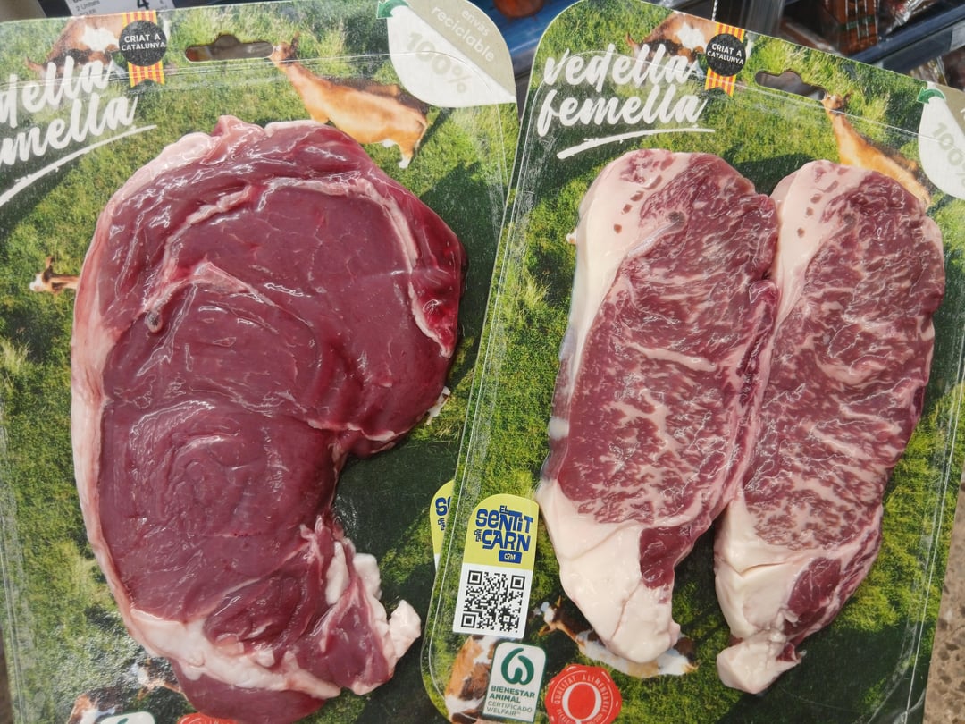 Right one does not look like a ribeye to me. Left one is very lean, not appealing at all. Edit: now I saw both pictures and it sais entrecote. That is not a ribeye, it is another cut lol.
