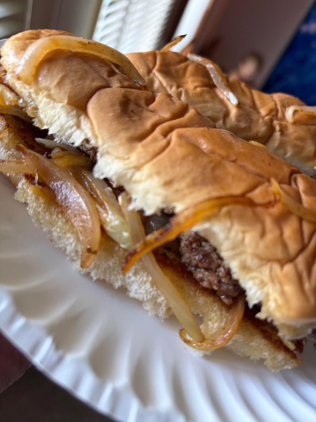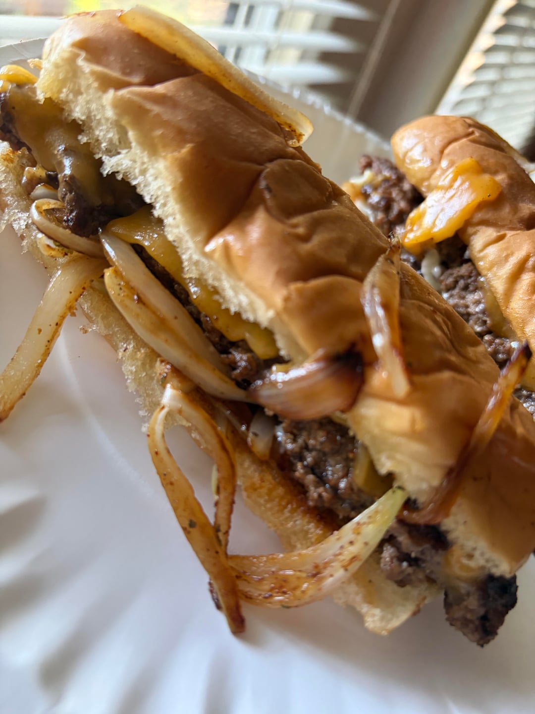 Grilled smash burger, precut raw into slices, salt, pepper, Vidalia onion, Tillamook cheddar, butter grilled buns and 88/12 Costco ground beef. So good!