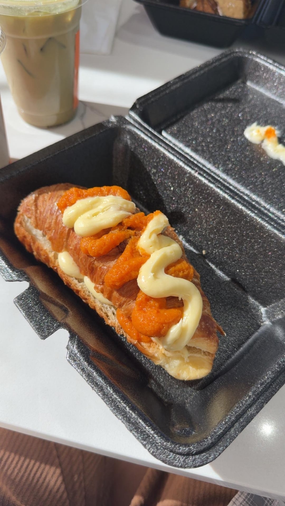 The chai is made with whole milk I believe and is the 8 oz size, on the croissant was pumpkin puree and cream cheese frosting. There was really only topping on the edge of the inside if that helps? They looked at me too seductively and I ended up eating the whole thing 😪 it was good! Made at the kaffa cafe in crownpoint Indiana, definitely recommend.