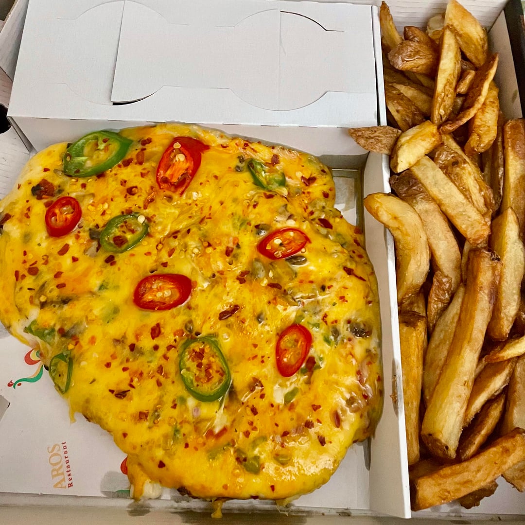 ‘Our specialty dish! A delicious crispy coated chicken breast covered with creamy béchamel sauce, Topped with a special mix of cheese lightly grilled, mixed peppers, onions, mushrooms, fresh chilies, sprinkled with chili flakes. Served with chips and freshly chopped salad’