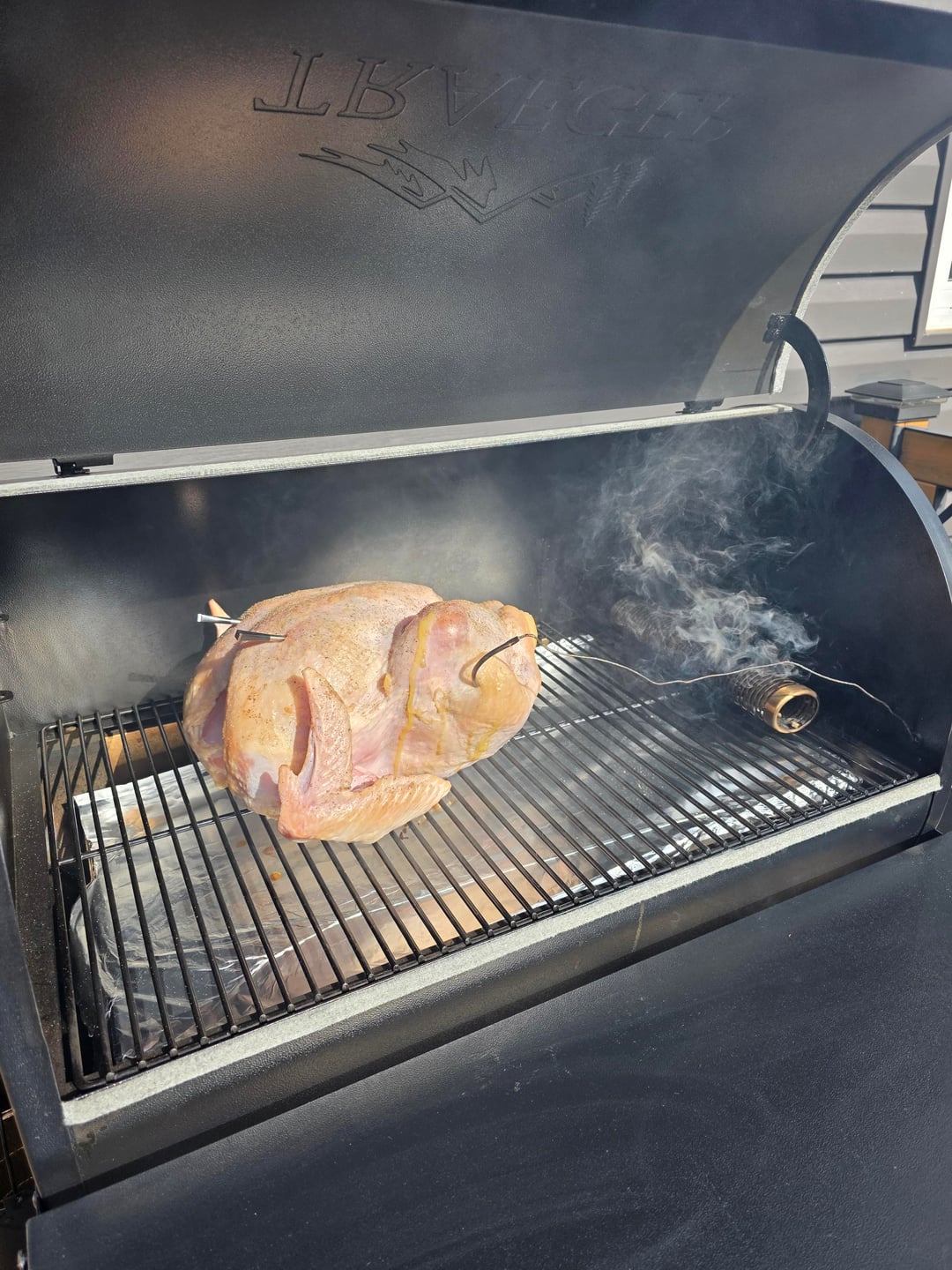Started.with a good grill clean, then prepped the turkey last night with a butter and maple syrup and herb injection. Salt and peppered the skin, then left in the fridge overnight to dry some.