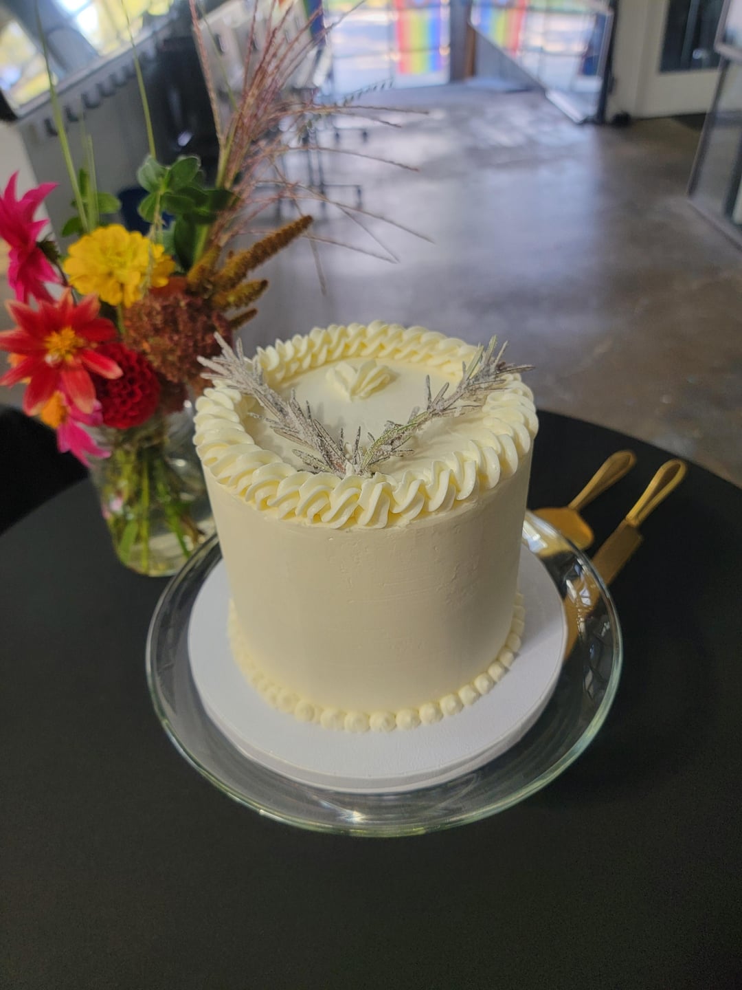 This was a 6" cake with Easy Buttercream (swiss meringue made with carton, pasteurized egg whites). Embellished with sugared rosemary sprigs.