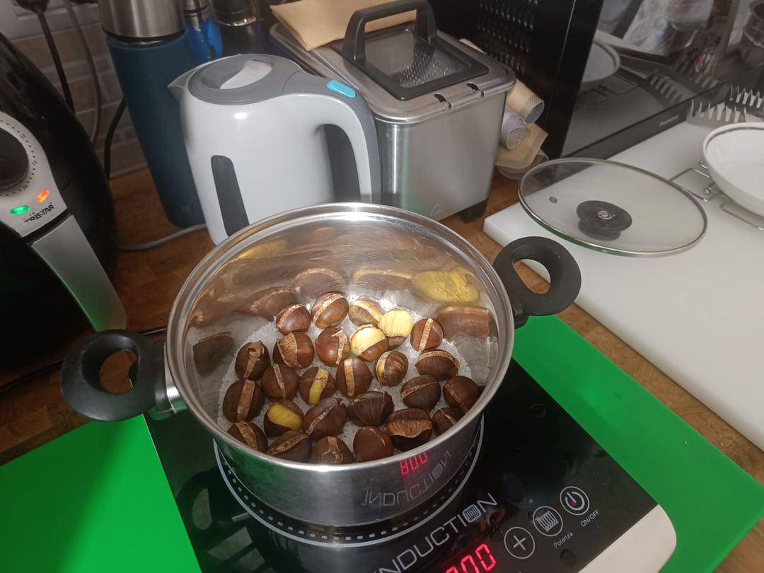– Cook them over coarse salt with the cut side facing up (otherwise the chestnuts will burn) and cook for about 7 minutes without the lid and 7 with the lid on (10 and 10 if the chestnuts are very large).