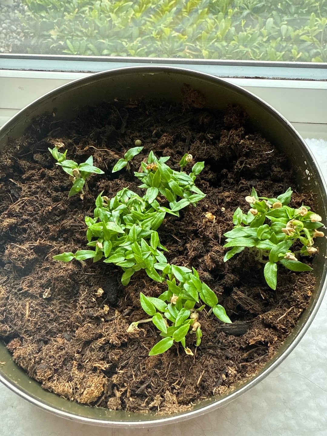 Started by putting some pepper cores in a can of dirt. Didn’t think they’d sprout. When they got about 3-4” I separated 8 of them into their own pots and put the rest in a group pot outside.