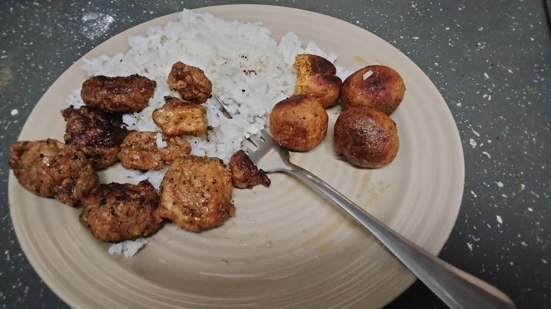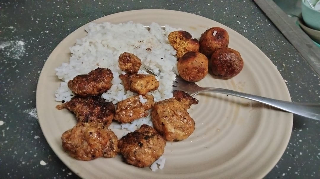 Battered and deep friend pork with a honey sciracha sauce, some white rice, and hush puppies made from leftover batter.