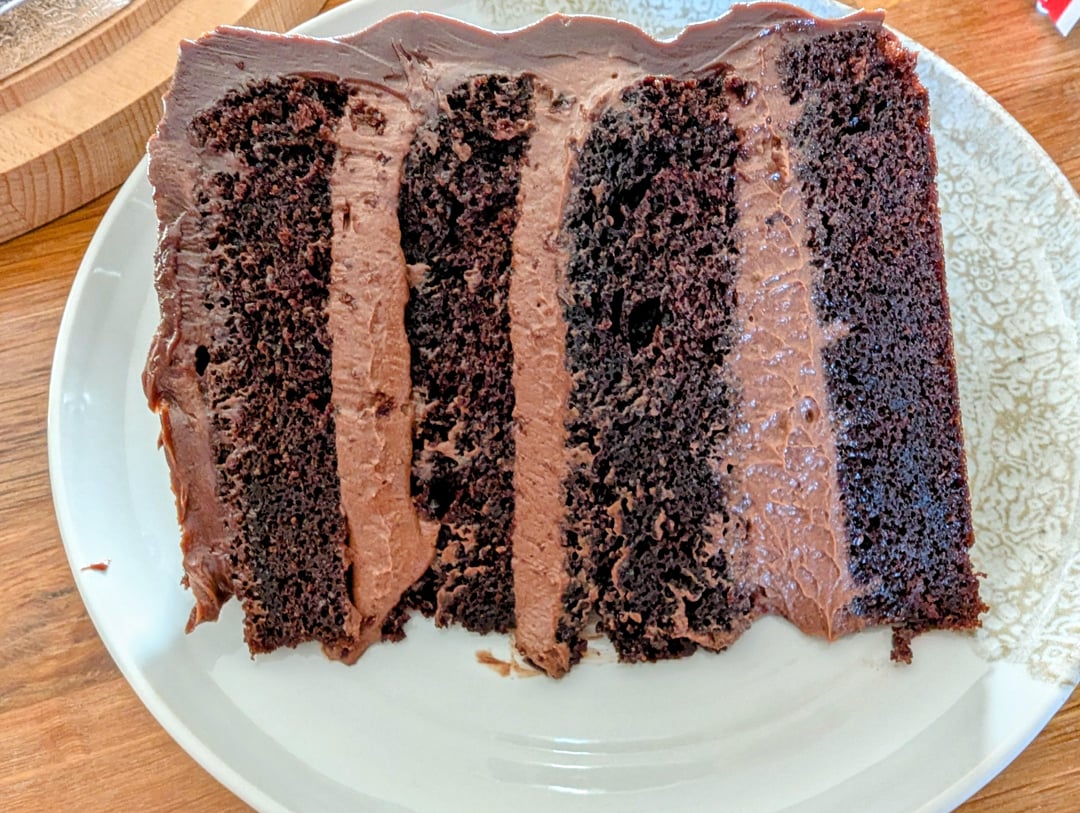 * Cut the cake layers into half to form 4 layers of chocolate sponge. You may need to level out the domed tops.