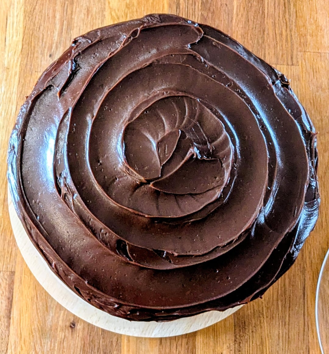 * Spoon/spread the chocolate ganache to cover the outside of the cake.