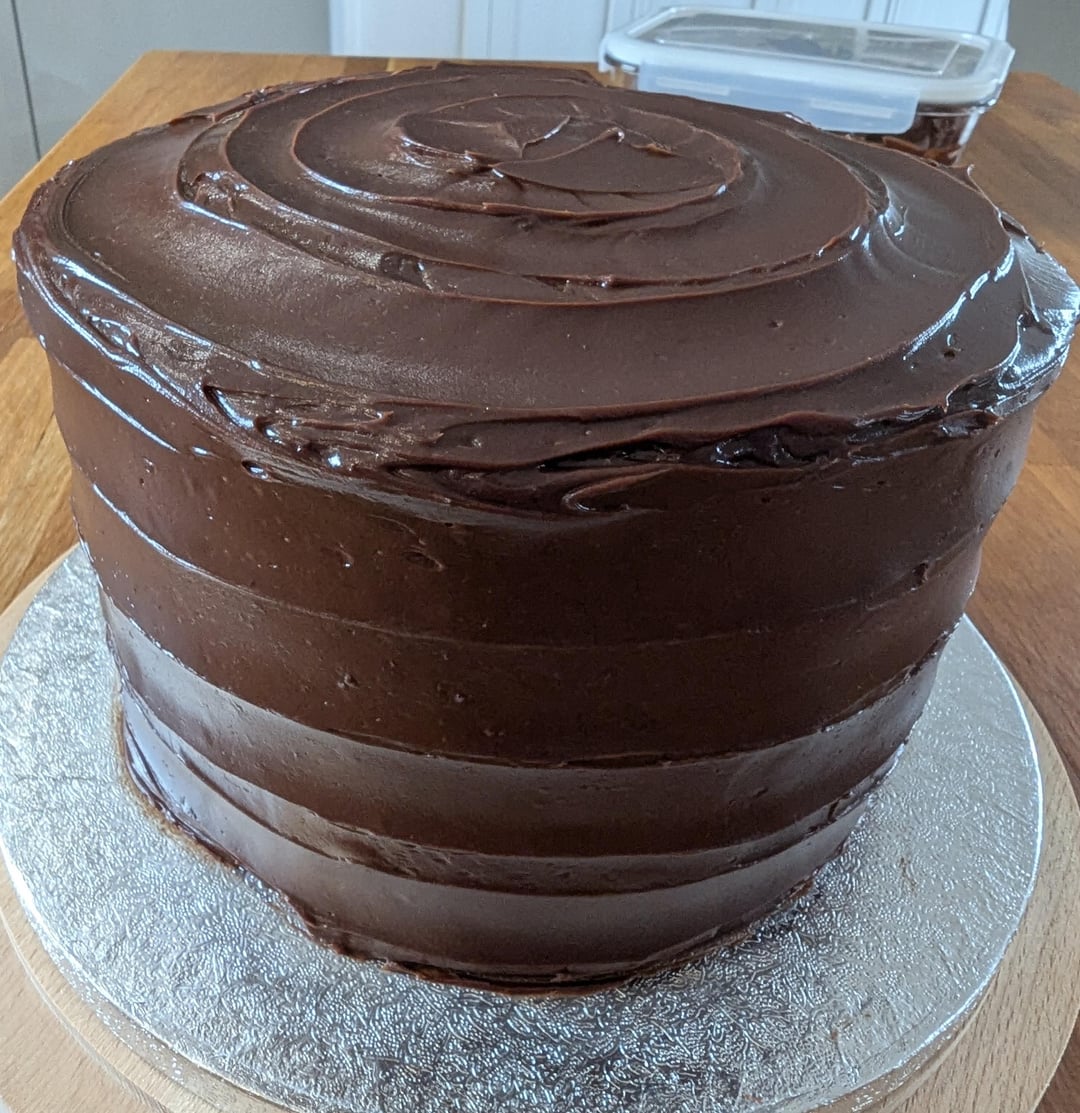 I made the tastiest chocolate cake I've ever made, and I'm so happy with how it turned out! It's four layers of chocolate sponge with dark chocolate mascarpone cream filling inbetween, with a silky chocolate ganache on the outside. I'll add the recipe in a comment below.