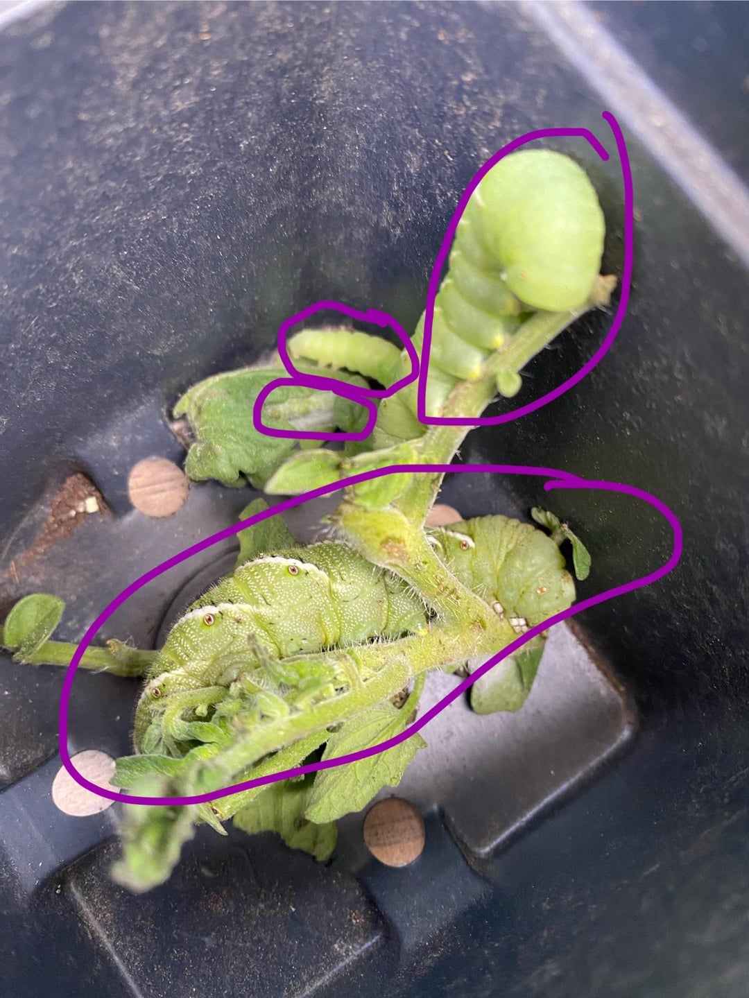 These are native beneficial pollinators (when they’re grown ups), even if they are a terror to the yields of tomato and pepper gardeners everywhere. These fellas look like they’re almost done and are getting ready to turn into adult adults, a.k.a. Moths. Why not give them whatever plant matter you cut from the plants and stick them in a corner somewhere far from your veggies. They’ll burrow into the soil to pupate in a few days and bother you no more until next year.