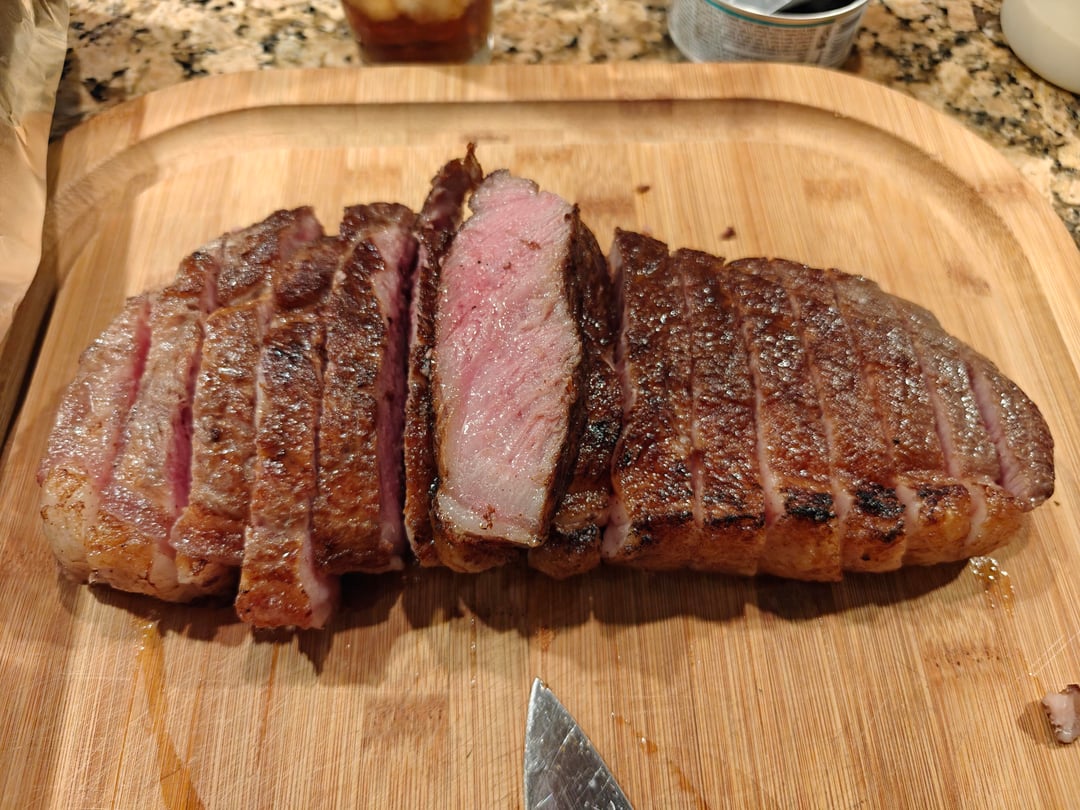 My fiance's brother and I went half and half on a 3.4lbs A5 Japanese wagyu new york strip roast (fiance hates steak so I made her chicken the same way). I sliced it into two steaks, heated them with my brand new breville Joule Turbo at 135°F for about 3.5 hours and then seared them on my salamander grill. How did I do?