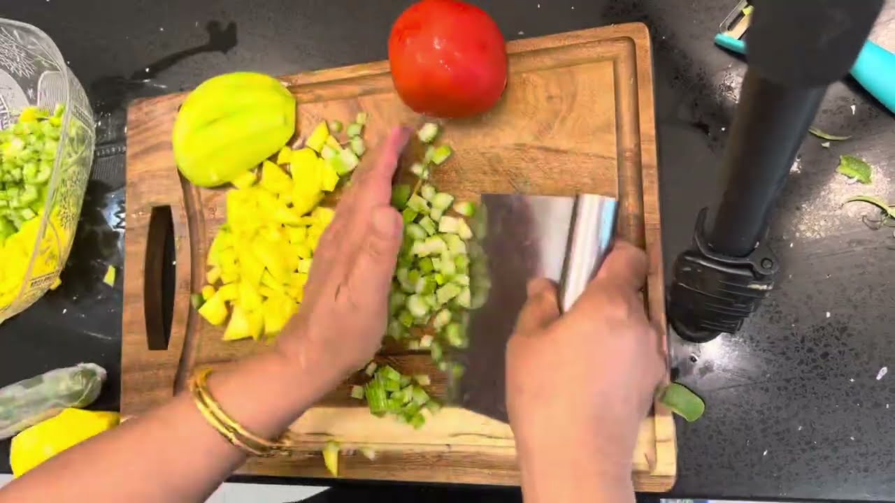 1. In a mixing bowl, combine mango, onion, red onion, tomato, celery, cucumber, basil, and cherry tomatoes.