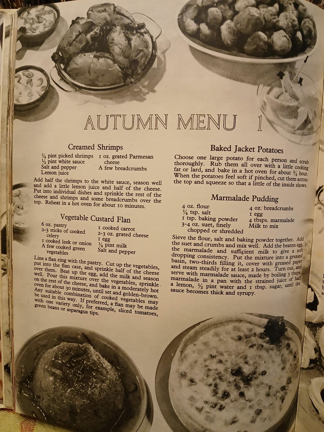 #AUTUMN MENU 1 ##Creamed Shrimps ¼ pint picked shrimps ½ pint white sauce Salt and pepper Lemon juice 1 oz. grated Parmesan cheese A few breadcrumbs