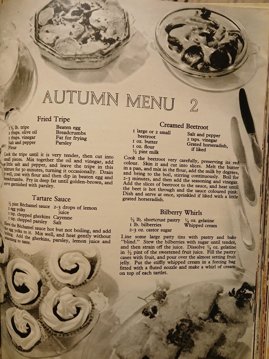 #AUTUMN MENU 2 ##Fried Tripe 1½ lb. tripe 2 tbsps. olive oil 2 tbsps. vinegar Salt and pepper Flour Beaten egg Breadcrumbs Fat for frying Parsley