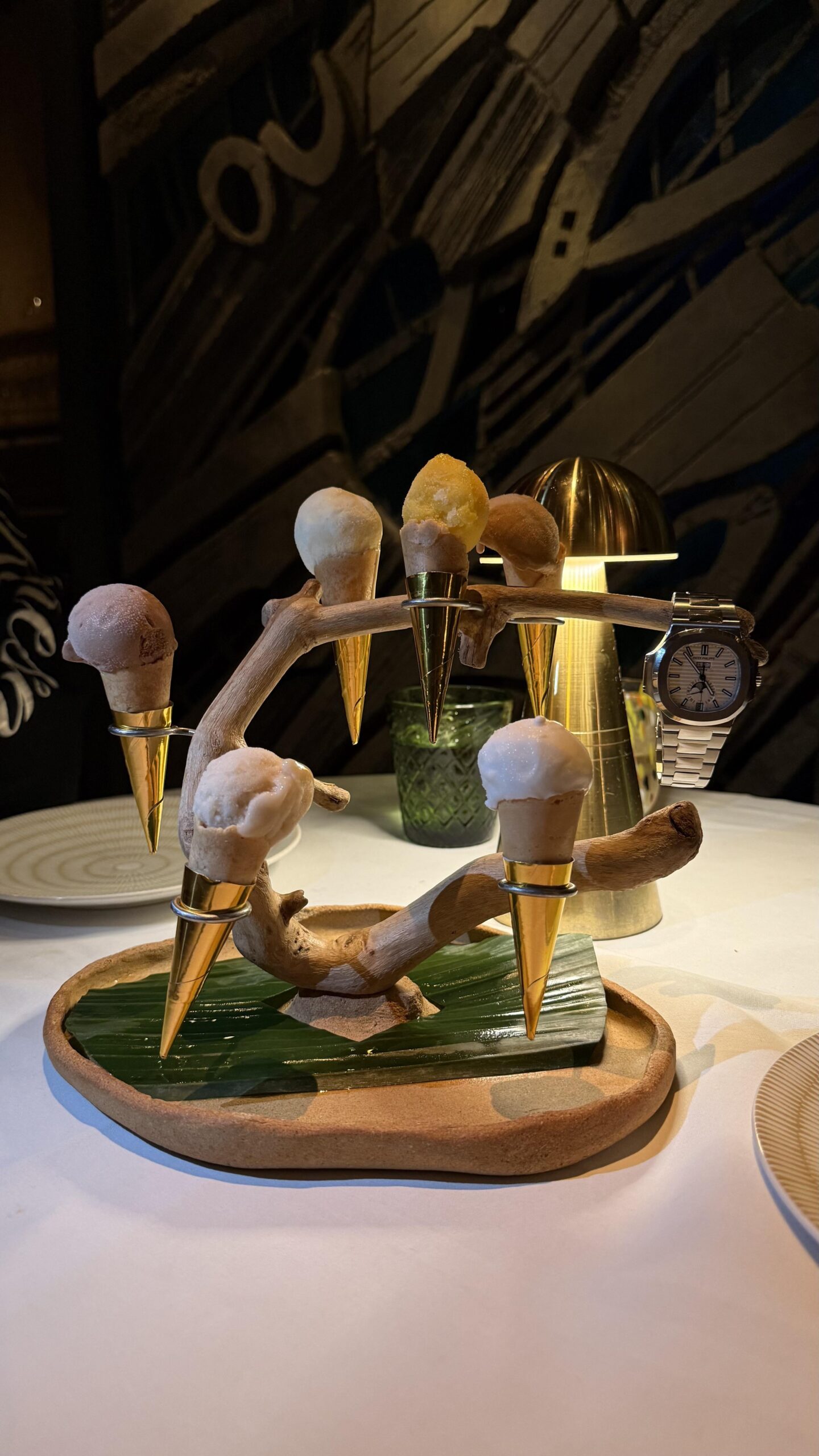 Some poor soul in the kitchen’s going to have a task wiping up the melted ice cream drips off of this antler candalabra, that the origami banana leaf failed to catch.