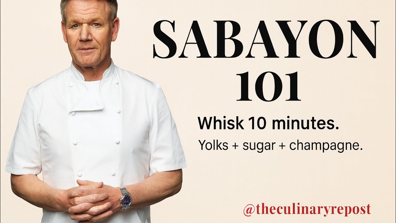 Learn how Gordon Ramsay prepares a classic French sabayon with Champagne and fresh citrus. This elegant dessert balances rich egg yolks, sugar, and sparkling wine, whisked over gentle heat until thick and foamy, then finished with a golden torch glaze.