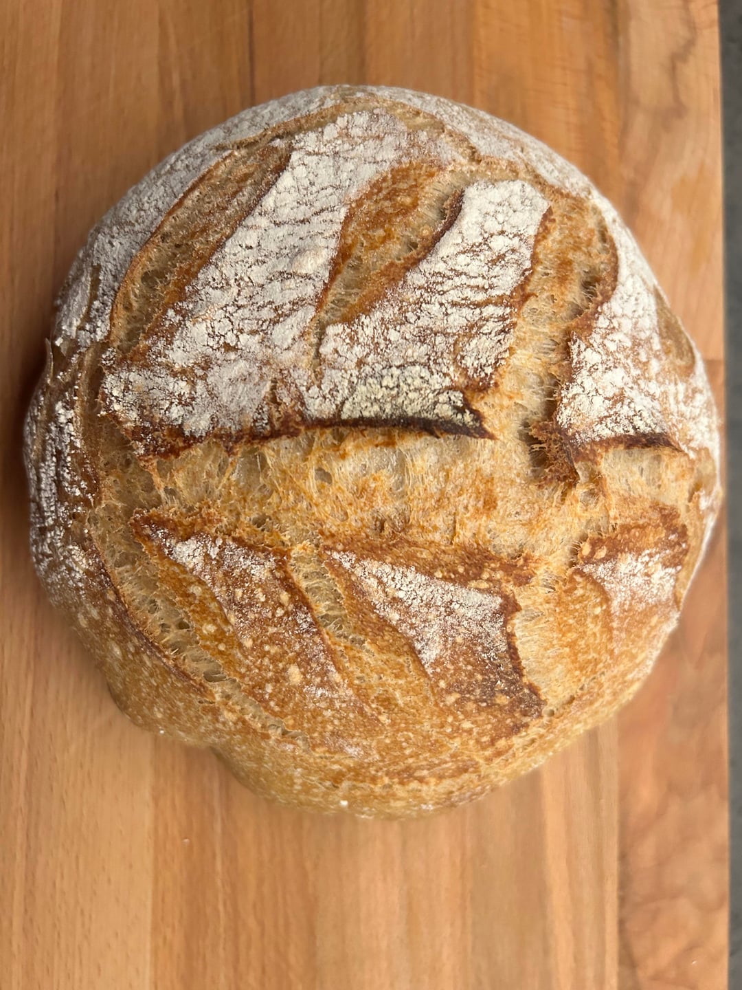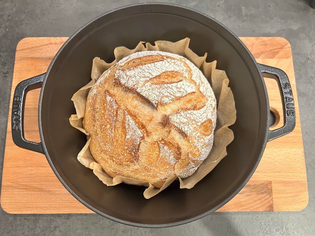 Baked 20 min at 250 °C (lid on) + 25 min at 230 °C (lid off) in a Dutch oven.