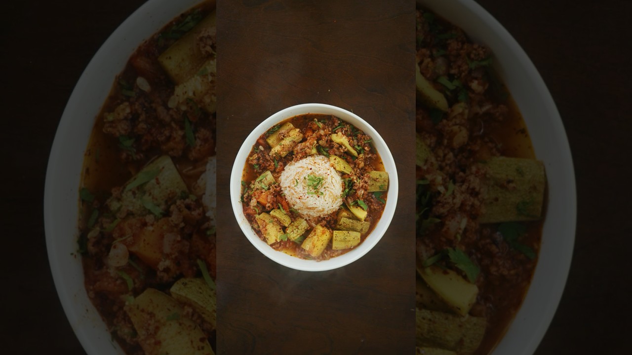 If you’re Arab, you already know Kusam machi is elite. But sometimes you really just don’t want to sit and stuff a million pieces just to cut them open. So today, I’m sharing what I call lazy kusa. I don’t know if I’m damaging or helping my culture here, but this looks great. Oh my god, it’s so good. Everything you love about kusa mashi, just mish mashi. Start by cutting an X on the bottom of 10 tomatoes and soak them in boiling hot water for 10 minutes. While they soak, dice a yellow onion and grind lots of garlic into a paste. The tomato peels should come off super easy. Now, I’m using gray squash and cutting them into pieces about the same size as the tomato. Saute the diced onion and ghee for a few minutes. Add 1 and 12 lbs of ground beef and cook until the fat starts to render out. Season with salt and Arabic seven spice. Add the tomato and cover and simmer for 10 minutes. Then, mash the tomatoes up. Add tomato paste, water or stock, and the squash. Bring to a simmer. Cover and cook for 15 minutes. Finally, flash fry some garlic and a bit of ghee and drop right into the stew along with some dried mint. Plate with vermicelli rice and enjoy.