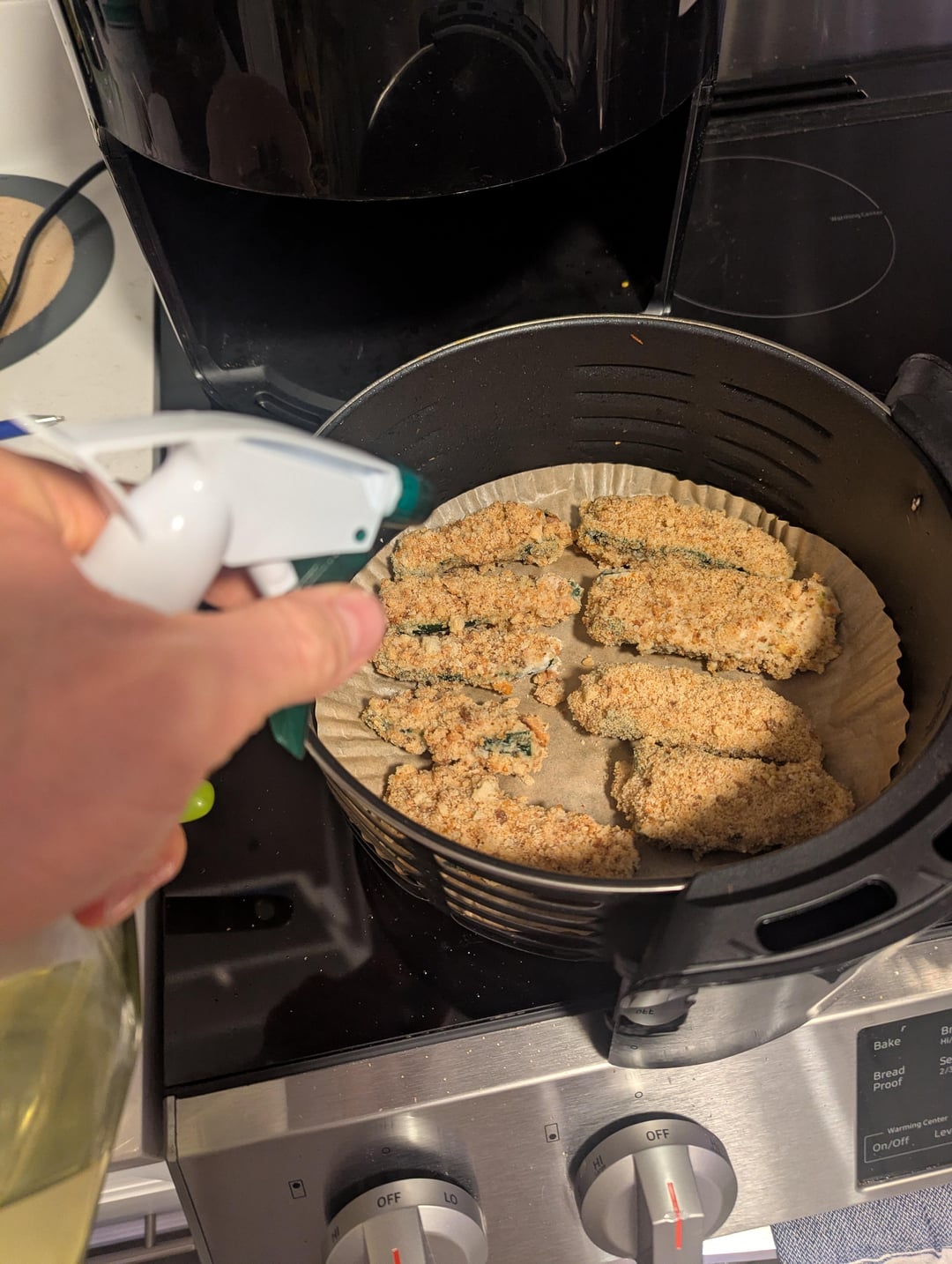 I then freeze the filled peppers for easier handling before breading them with a combination of flour/water for dredging, and breadcrumbs.