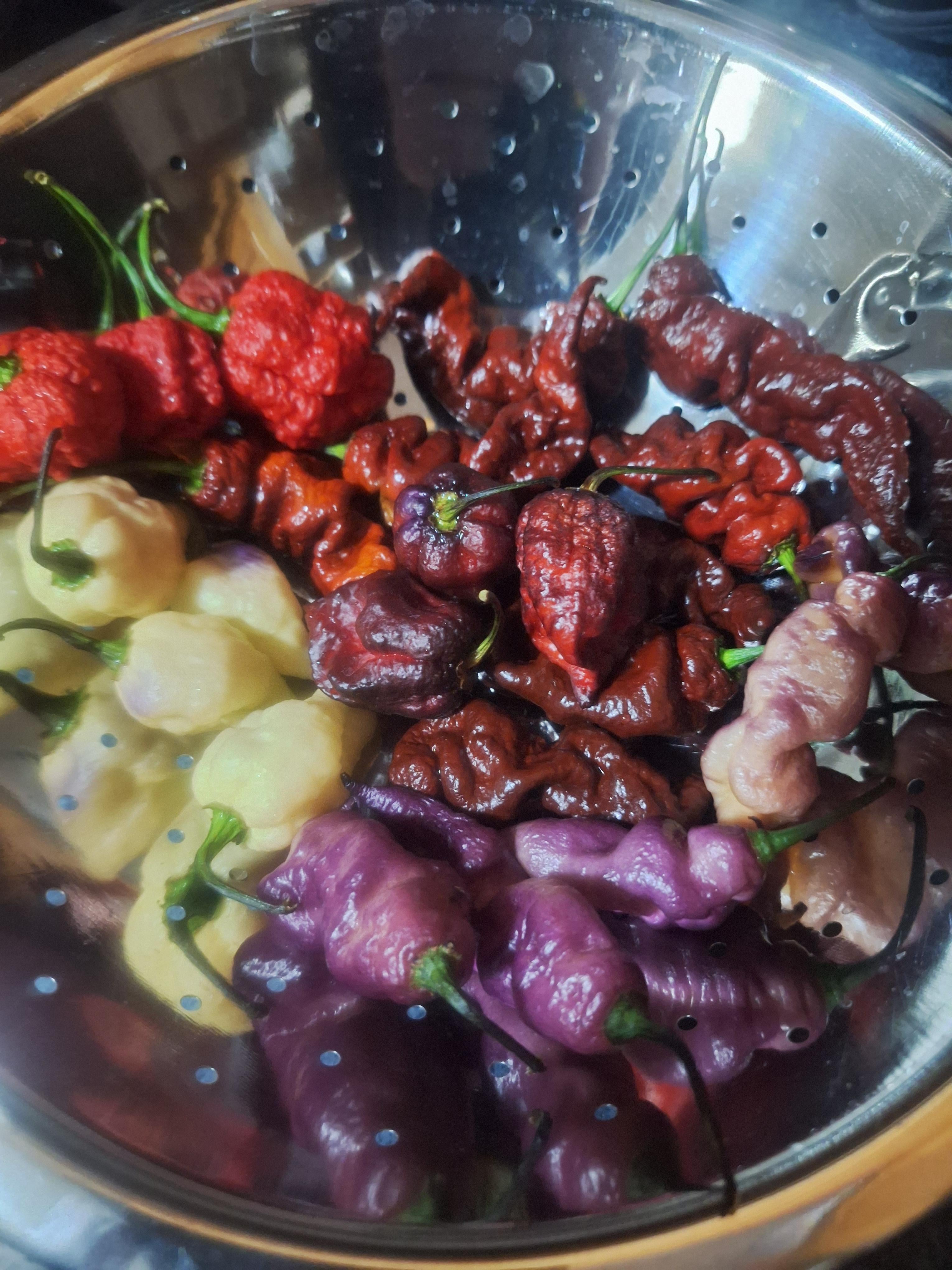 Gonna put all these in a batch of salsa. 3 Purple Gator jigsaw, 5 Jays pink, 4 jays lemon reaper, 3 RB003, and 8 Chocolate primotalii