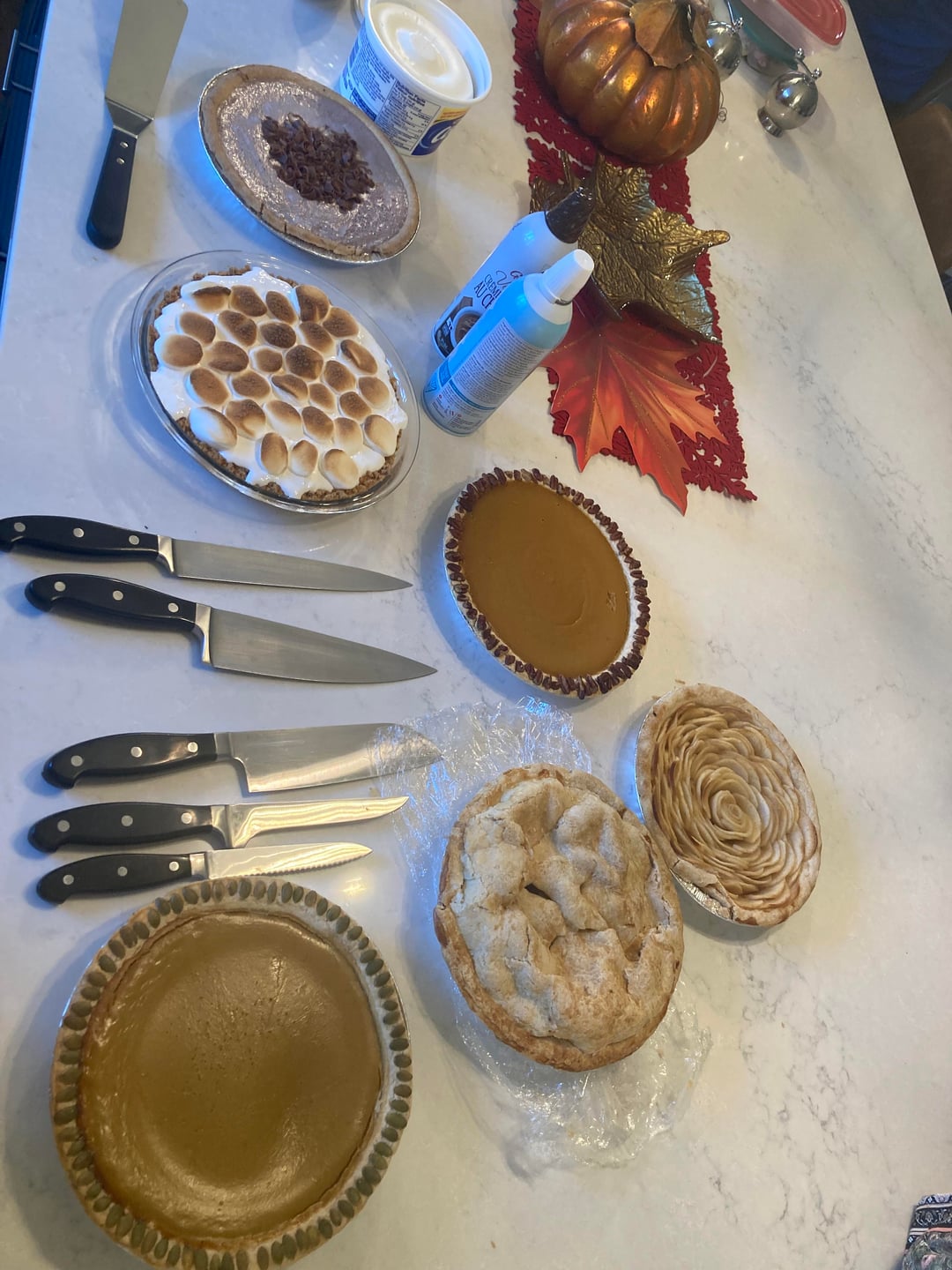 Pumpkin, sweet potato, apple, sugar free apple, and last pic has all the desserts, including my chocolate mud pie and my cousin’s s’mores pie. Let me know if you want the recipe for any of them but the s’mores pie as I didn’t make it.