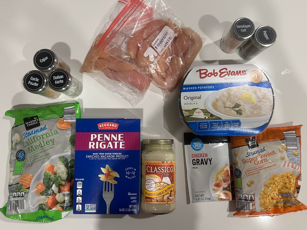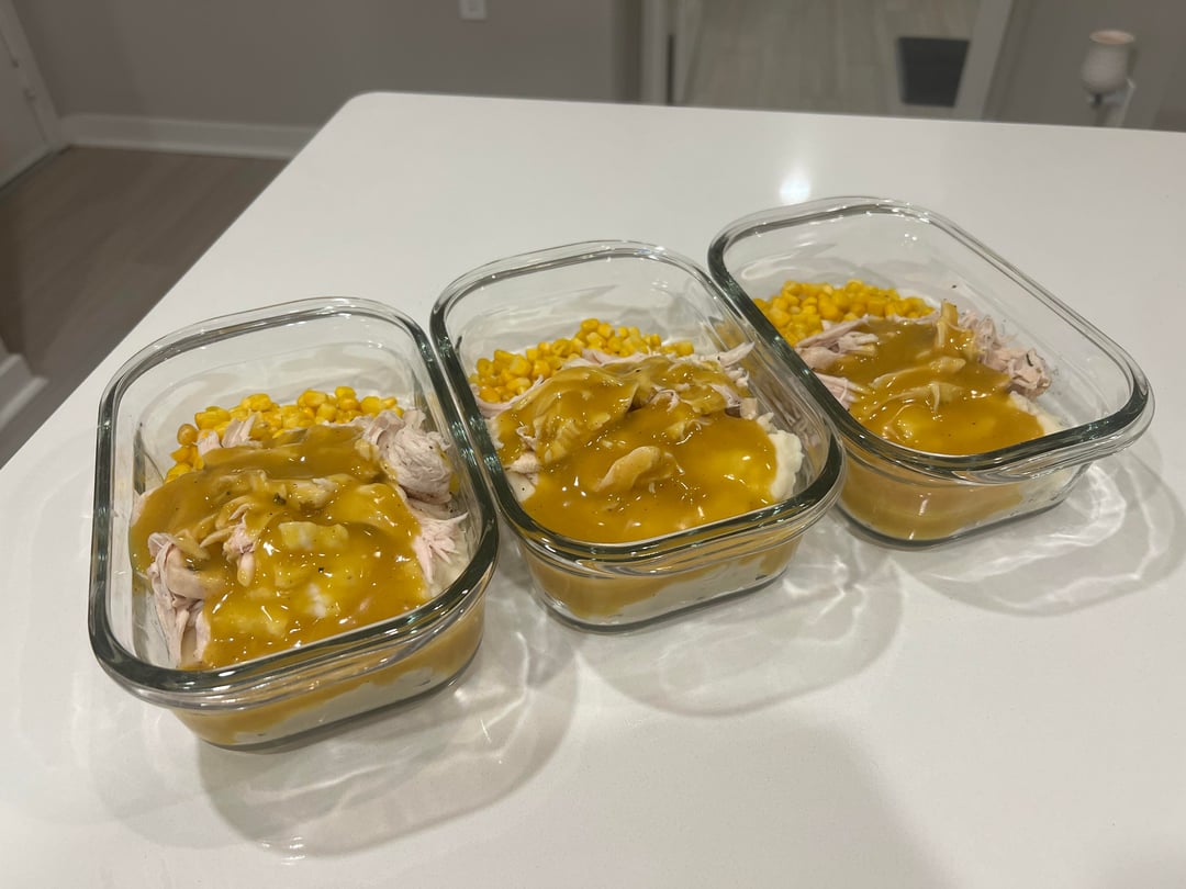 I started by trimming & patting dry my chicken tenderloins. I put them on a baking sheet (lined with tin foil) and seasoned with seasonings listed above. I baked them for 12 mins in the oven at 400°f (bake until 165°f internal temp). I microwaved the potatoes for 3 mins, served, and distributed between the containers. I microwaved the corn for 5 mins and did the same. Then shredded my cooked chicken and put that on top. Follow the instructions on the packet for the gravy because they are all slightly different 🙂 I poured the gravy on top and voila! My husband’s favorite meal prep (which is why I gave him gigantic servings lol). Enjoy!