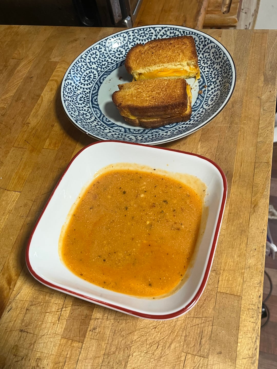 Holy moly, did this come out right! I usually do butter and/or mayo, we have one of those olive oil sprayers so it was much easier and less messy. Might have to be my default going forward. 8 min @ 400° with a flip at the 4 min mark. Perfection. Tomato soup because it’s the perfect weather for it today.