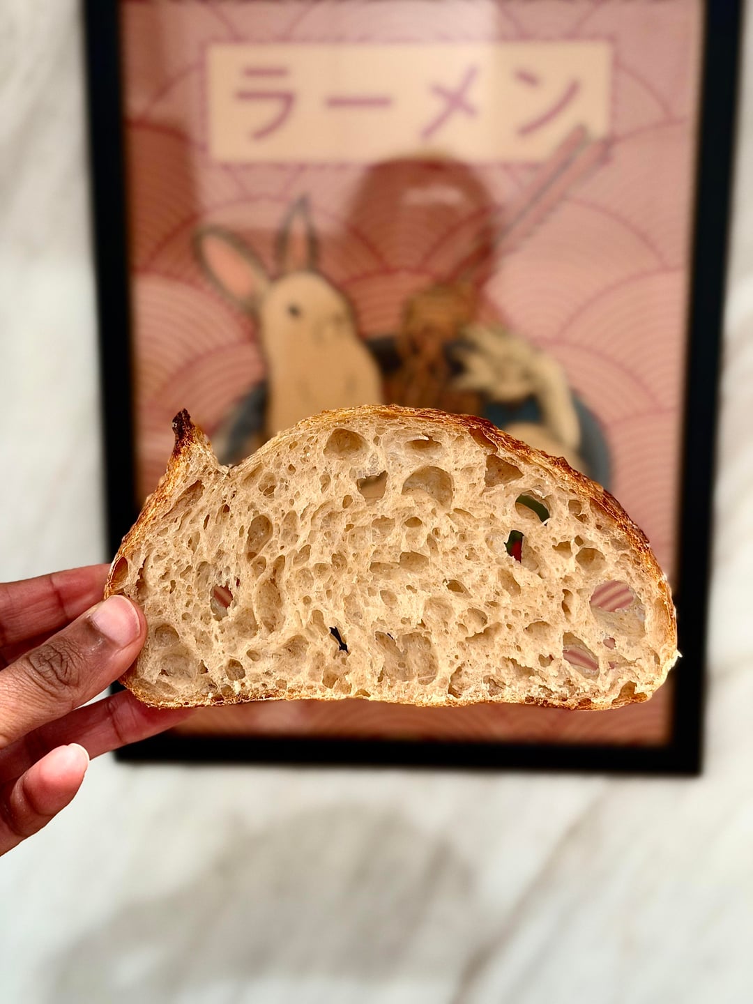 I had to do a cold retard of the bulk in the fridge due to time constraints. Then after shaping, another couple of hours in the fridge. 7 hour autolyse, 1 stretch and fold, lamination, and 3 coil folds, the last of which was during part 2 of the bulk. I was hoping that the long autolyse and fewer folds than usual would help my dough expand more in the oven but even though my oven bloom was all right, the crumb was still tighter than I’d prefer. I’ve plateaued again it seems, but at least it’s a higher plateau than before. Baking while wholly without talent is not for the weak.