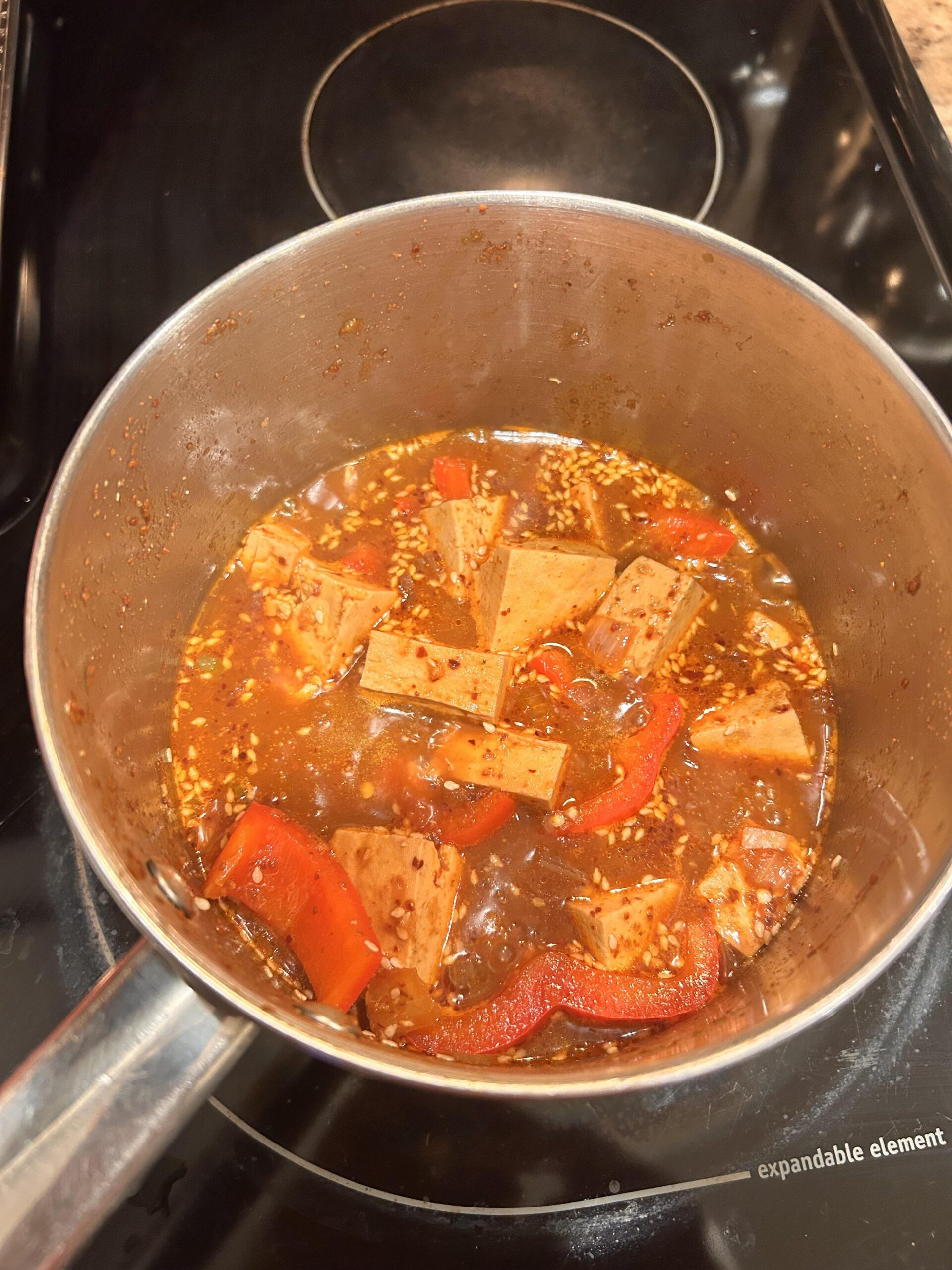 Since you asked, it is my humble criticism. Normally Korean don’t put paprika in their Dubujorim. We put onion to get some sweetness. I imagine that the paprika taste may not blend into the Jorim. You can add one or two pinches of sugar, though. Try grind or smash the sesami seeds and add them before it is served. And reduce the soup until the volume decrease to 1/4or less.