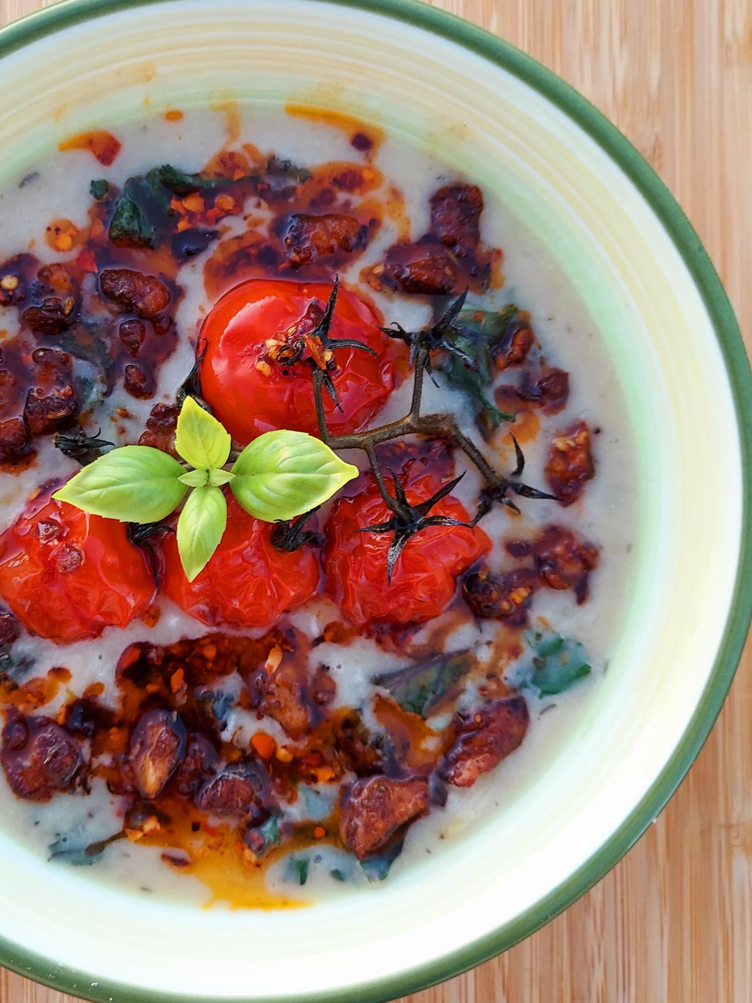 A puree of California Corona and Marcella beans with purple kale, By the Brook tempeh sausage crumble, and roasted tomatoes on the vine. Finished with Calabrian chili oil by Tin Man Oils.