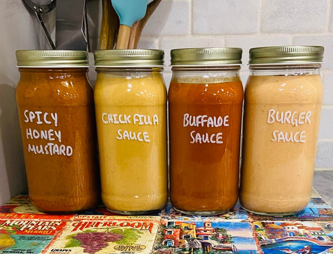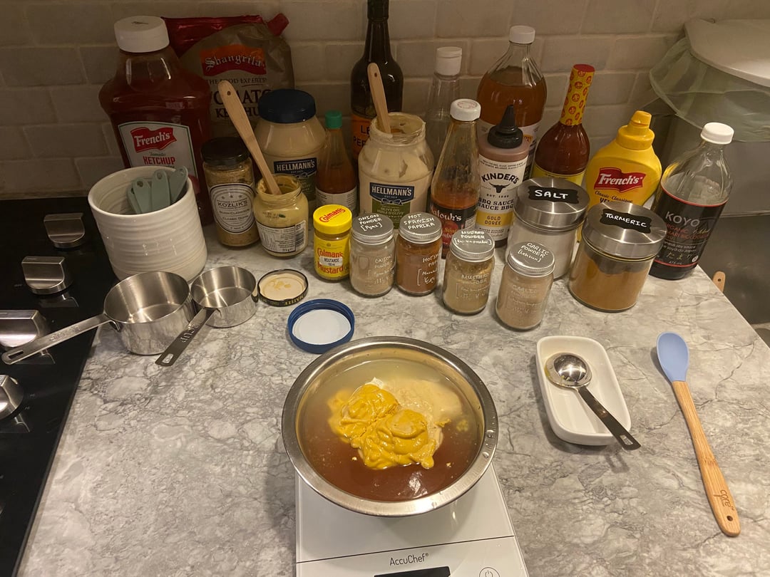 All homemade. My favourite is the spicy honey mustard. So basically what happened was that I was following Joshua Weissman’s recipe (he uses aleppo pepper but I didn’t have any so I used Hot Paprika) and I wanted to make a big batch and so quadrupled the recipe and it ended up being way too much Hot Paprika, spicy but tolerable and so now it has become a family favourite and I have to make a normal Honey Mustard for the kids 😆