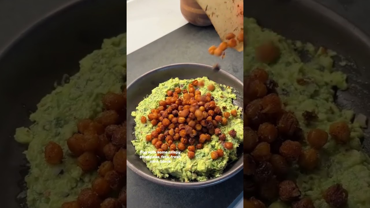 If you want to add a Mediterranean spin to one of the most iconic dips and spreads, combine diced red onion, jalapeno, cilantro, garlic, and a few good-looking avocado. Squeeze in some lime juice, then mash or chop it up using a knife. Add it to your favorite serving dish. Top with some crispy chickpeas, feta, fresh mint, black olives, some toasted walnuts, and pomegranate. This is so easy to make and it’s so good. Full recipe is in the caption. Check it out.