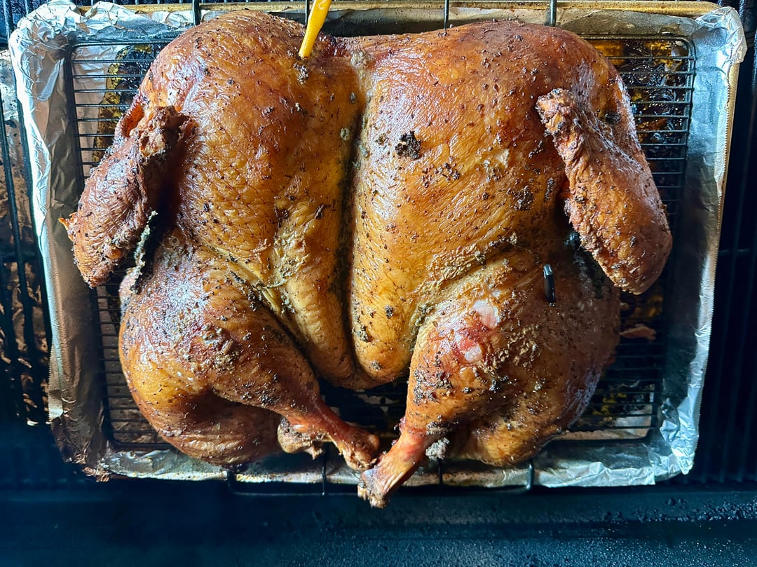 Dry brined 2 days with sea salt and fresh sage/thyme/black pepper salt. Did not rinse. On a rack with carrots and onions under 225F super smoke for 1 hour. 425F for 2.5 hrs until breast was 150F, then turned off and left in residual heat until carved a couple hrs later.