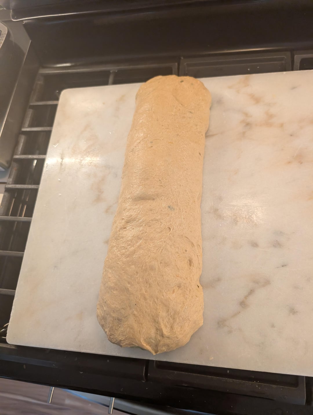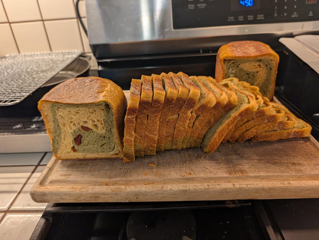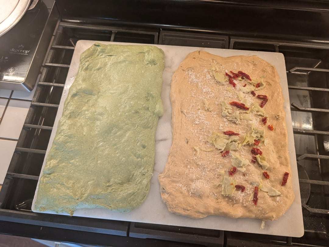 I made spinach artichoke and tomato soup swirl sourdough bread better placing the water in my dough with spinach and basil puree and the other half of the dough and replace the water with homemade tomato soup. The bread has artichoke hearts, sun-dried tomatoes and Parmesan baked into it. Nothing was added between the bread slices except for the cheeses. What say you, am I innocent of any grilled cheese malfeasance? Did I successfully finesse the rules?
