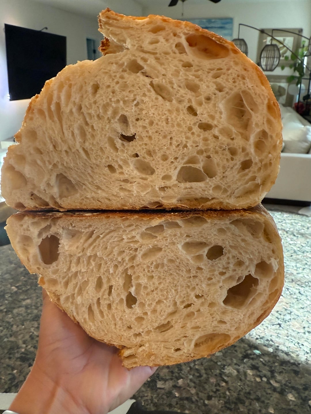 Combine and let rest for 30 mins. Stretch and folds, 3x 30 mins rest. 1 more stretch and folds then let rest for 4 hours. Preshape and let rest for 30 more mins. Final shape then cold ferment for 10 hours. I preheated the oven at 450 with the challenger bread pan. I did not have time to wait to let it heat so I put the dough as soon as it hit 450. Bake 20 mins covered then 20 mins uncovered.