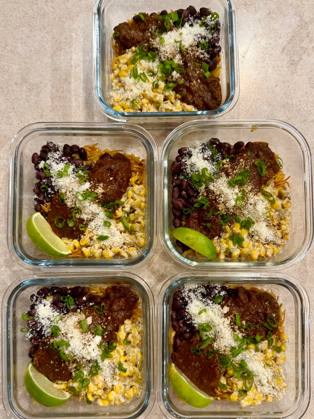 I had some odds and ends I needed to use up, so I built a meal prep around them — Knorr Mexican Rice and a can of black beans from the hurricane stash, plus roasted corn and chicken molé from Trader Joe’s. I knew I wouldn’t have enough starch, so I made a quick batch of fideo seco to fill it out. The corn needed some richness, so I leaned into a street corn vibe with a little mayo, Tajín, lime, and cotija. Hopefully this one’ll be a good one! I’ll put the recipe in the comments.
