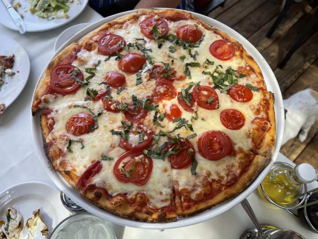 She and her party enjoyed the Burrata Special—mozzarella, prosciutto di Parma, marinated artichokes, roasted red and yellow peppers and sun dried tomatoes—and a Margherita pizza, along with orders of the tortellini and meatball soup.