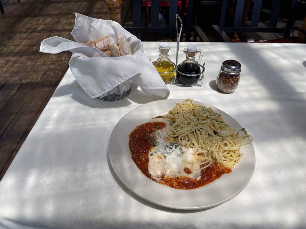 Chicken Parmigiana with Spaghetti alla Carrettiera. Photo by Robert Eliason.