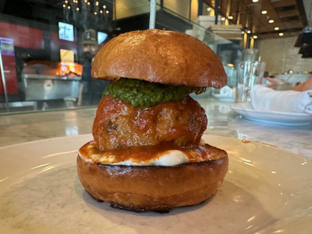 The meatball slider is equally delicious, featuring herb ricotta, parmesan, and pesto. Feels like a bite of Italy!