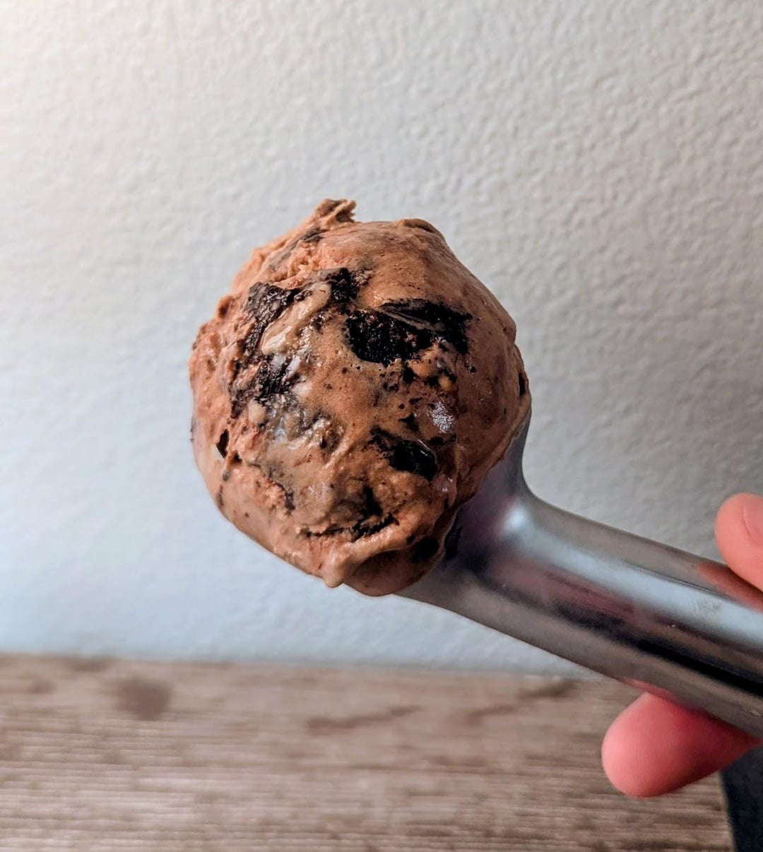 The ice cream base is strongly coffee flavored and pairs well with the rich, chewy chunks of fudge (which were supposed to be ribbons, but I've learned that I'm not so good at getting that right). This recipe is on the softer side and is nearly ready to scoop direct from the freezer.
